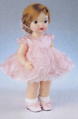 Terri Lee Pretty in Pink is dressed in a pink satin and organza fancy dress. Her accessory is a hair snood which is a 1950’s accessory that is a knitted or (in our doll – tulle) bag to keep curls and hair in place.