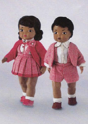 Tiny Bonnie Lou & Benjie are sold as a set dressed in coordinating costumes. Costumes are made in a light-weight wool red herringbone. This is the very first time “Tinys” have been introduced in the ethnic dolls. All Tiny Dolls continue to have the walking mechanisms.